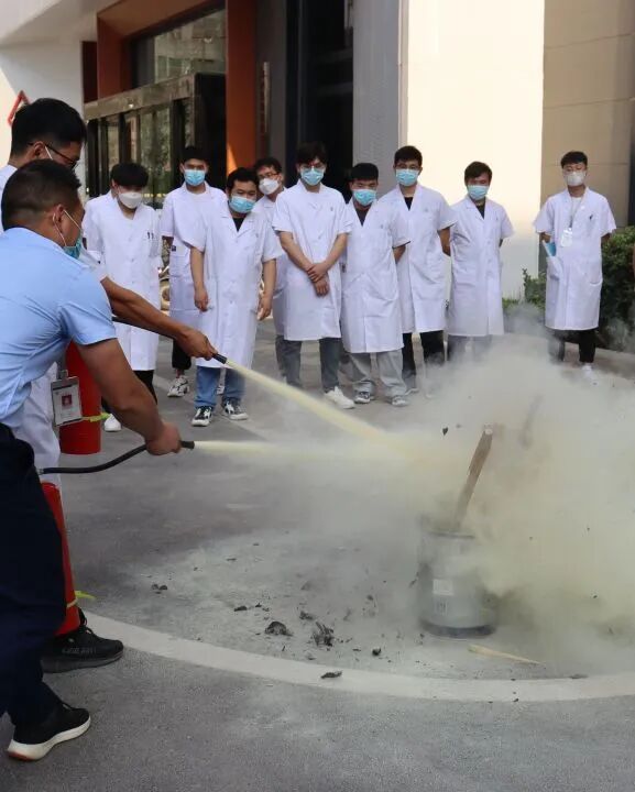 到达一楼后,又在指导下,轮流使用干粉灭火器扑灭模拟火源。